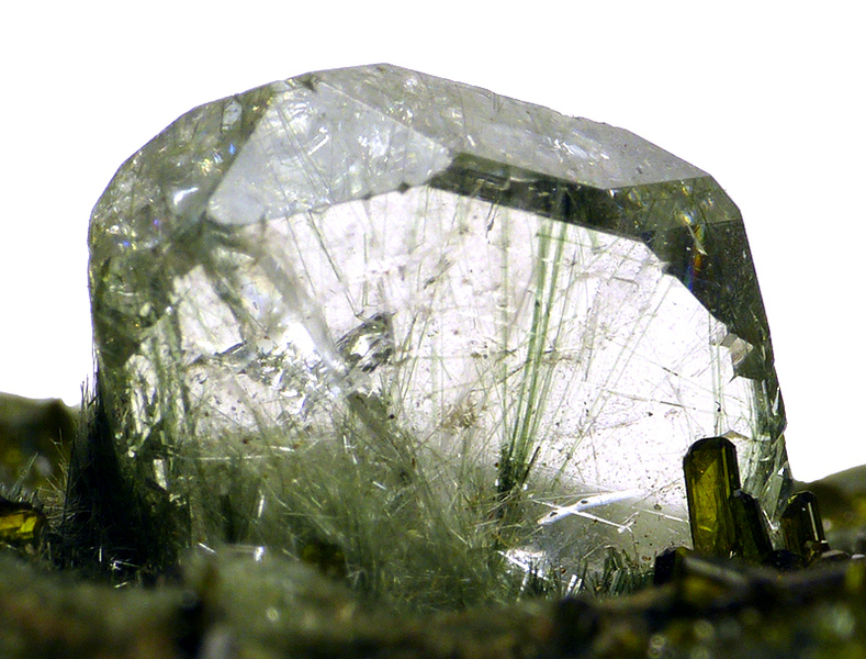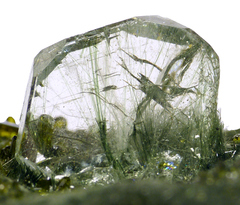 Amphibolite matrix specimen with high quality apatite. The main crystal measures 13 mm across and features inclusions of fine byssolith needles. The specimen is in excellent condition.