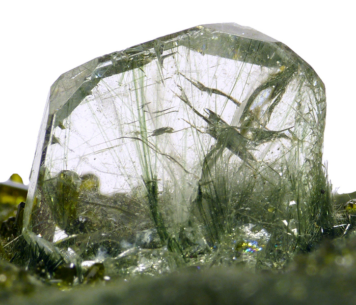 Highly translucent epidote crystals emanating from a growth faden. Ex Volker Betz.