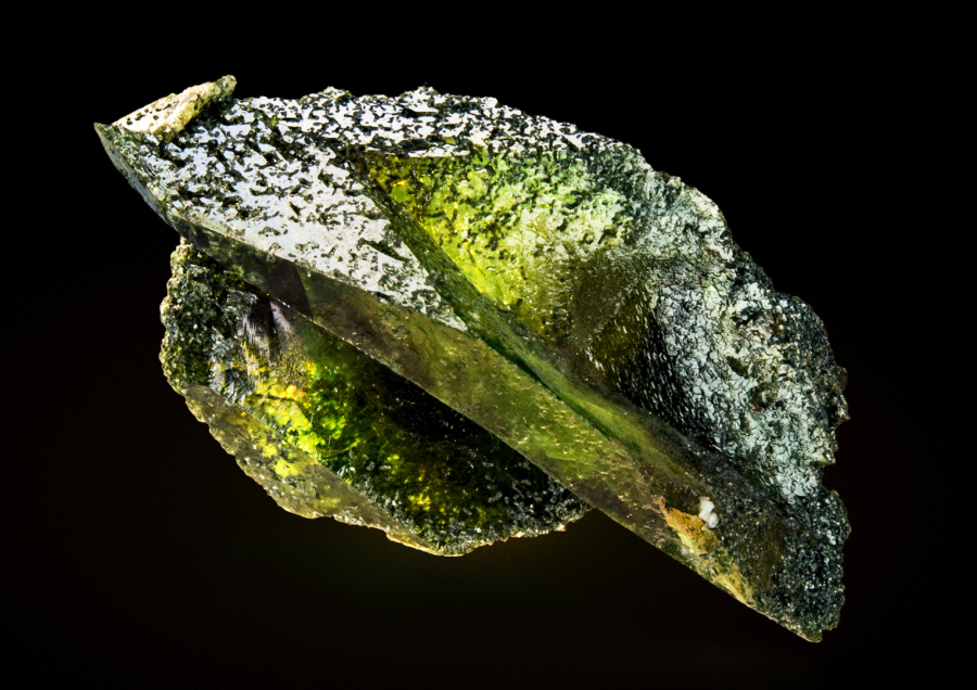 Floater piece of doubly-terminated rock crystals with dense greenschist inclusions to the prism faces. There are three crystal generations, the largest 1st generation crystal measuring 85 mm. From a well-documented find of the local collector R. Bacher in 2003 (cf. Lapis, Nr. 5, 2011).